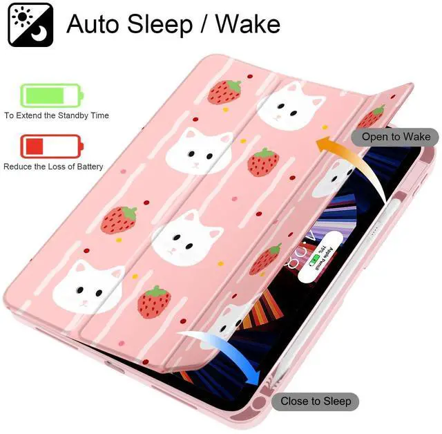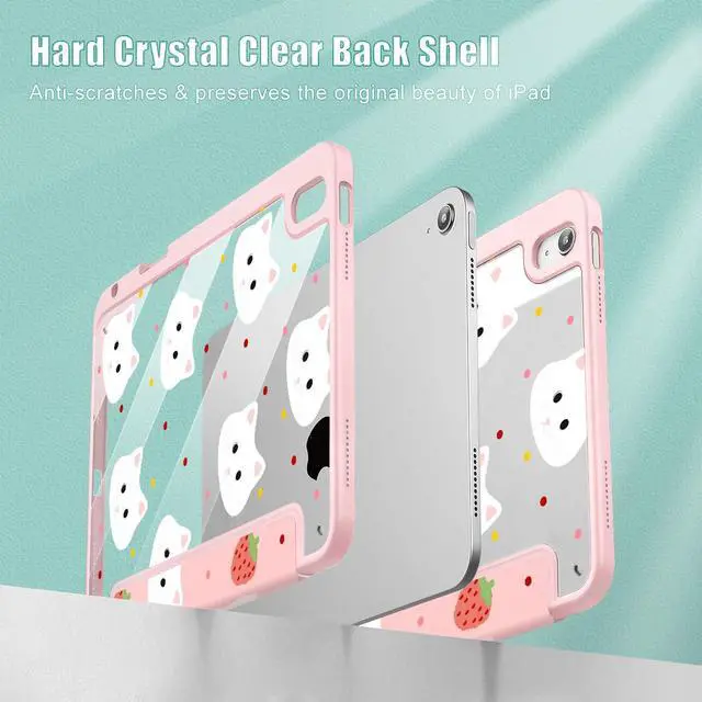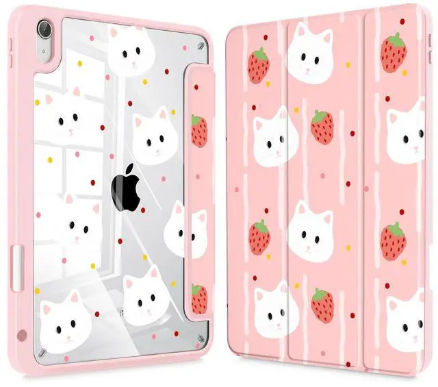 Lepeoac Case for iPad 11 inch A16 2025 Generation 11th / iPad 10.9 inch 2022 10th Gen, Buit in Pencil Holder with Shockproof Cover Clear Transparent Back Shell Auto Wake/Sleep, Cat Strawberry