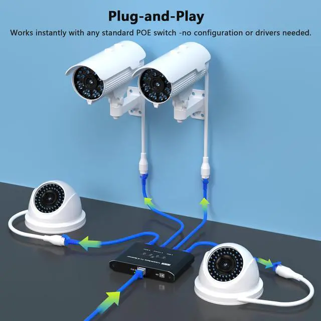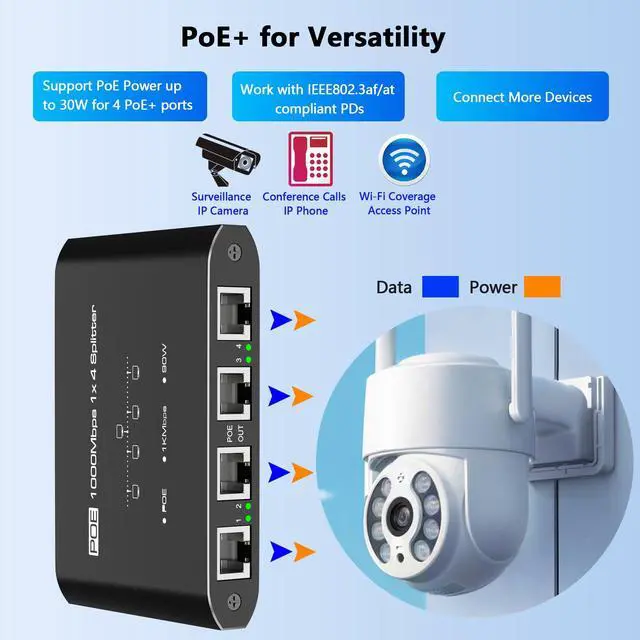4 Port Gigabit PoE SplitterTransform a single PoE Splitter port into a 4-port PoE Splitter solution, delivering true Gigabit speeds (10/100/1000Mbps) and 30W per port. Simultaneously power IP cameras, WiFi 6 APs, and VoIP phones - perfect for expanding networks without additional wiring or switch investments.