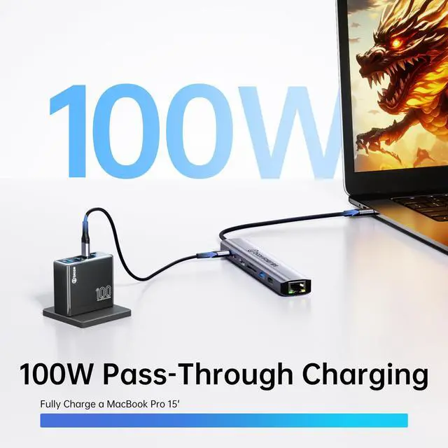 100W PD Pass-Through Charging & Built-in Safeguards Keep your MacBook Pro or other Type-C laptops powered at full speed with 100W PD Charging. This USB C docking station intelligently safeguards your expensive devices against over-current, short-circuit, and over-voltage, ensuring complete peace of mind while you work or play.