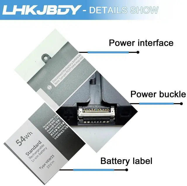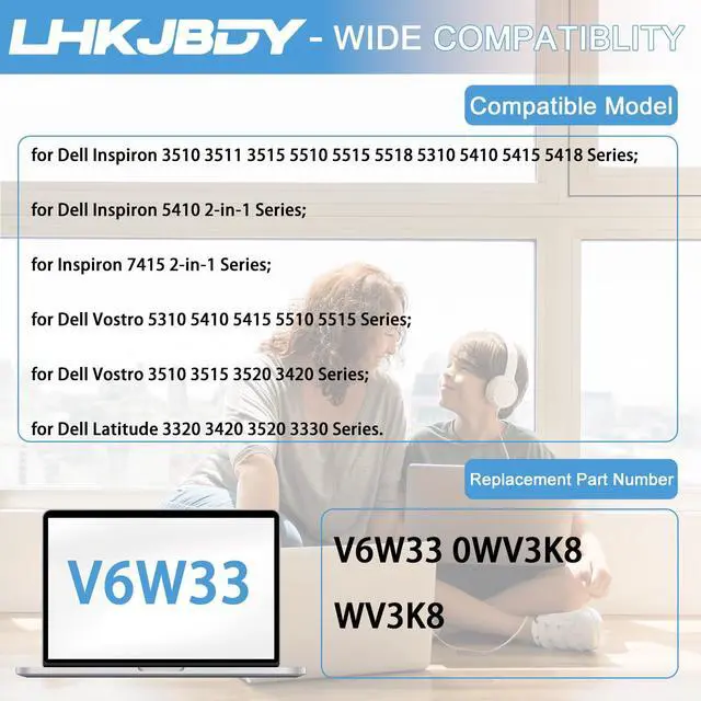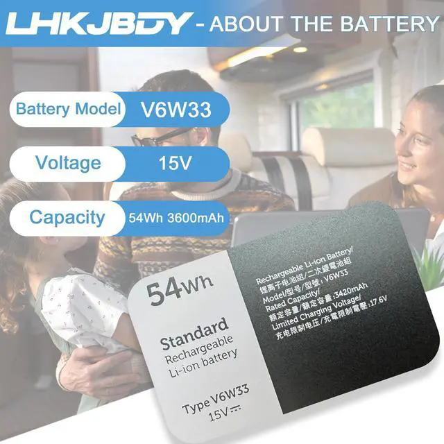 Specifications: Type: V6W33; Voltage: 15V; Capacity: 3600mAh/54Wh; Color: Black. Battery type: Lithium-Ion; The Packages includes: 1pcs V6W33 Laptop Battery Replacement, 2pcs Screwdrivers, 1 pcs Instruction for V6W33 Battery. The batteries are certified by UL and CE, ensuring safety and high performance