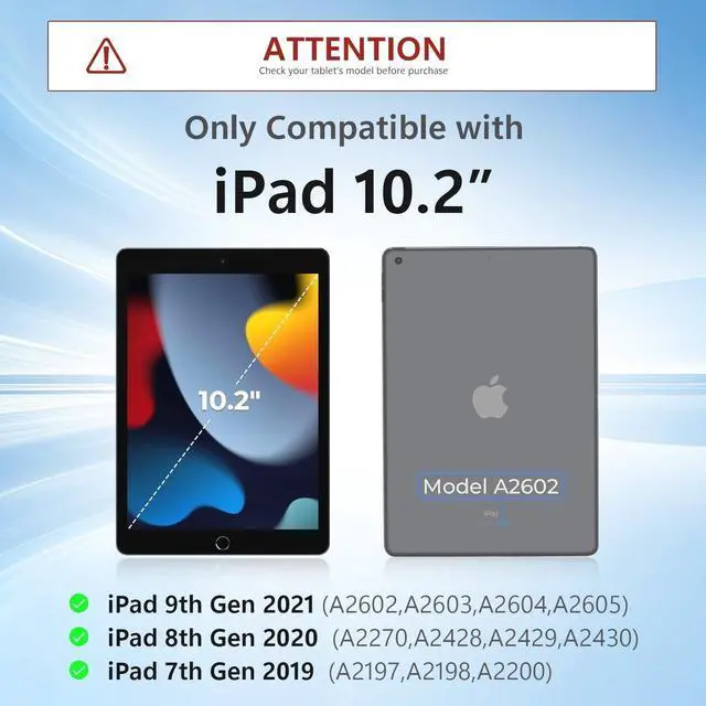 Case with Keyboard for iPad 10.2 /Pro 10.5 CompatibilityCompatible with iPad 9th Gen (2021, 10.2 inch) Models A2602 A2603 A2604 A2605; iPad 8th Gen (2020, 10.2 inch) Models A2270 A2428 A2429 A2430; iPad 7th Gen (2019, 10.2 inch) Models A2200 A2197 A2198; iPad Air 3rd Gen (2019, 10.5 inch) Models A2123 A2152 A2153 A2154; iPad Pro (2017, 10.5 inch) Models A1701 A1709 A1852. Please check your iPad model number on the back of your device (starting with "A") before purchasing to ensure compatibility.