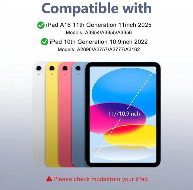 Compatible Model The keyboard case is only compatible with iPad 11th Generation 11 inch A16 2025 (Model:A3354/A3355/A3356) and iPad 10th Generation 10.9 inch 2022 (Model:A2696/A2757/A2777/A3162).Please check the model number starting with "AXXXX" on the back of your iPad before purchasing (Note: This product does not include : tablets, pencils! )