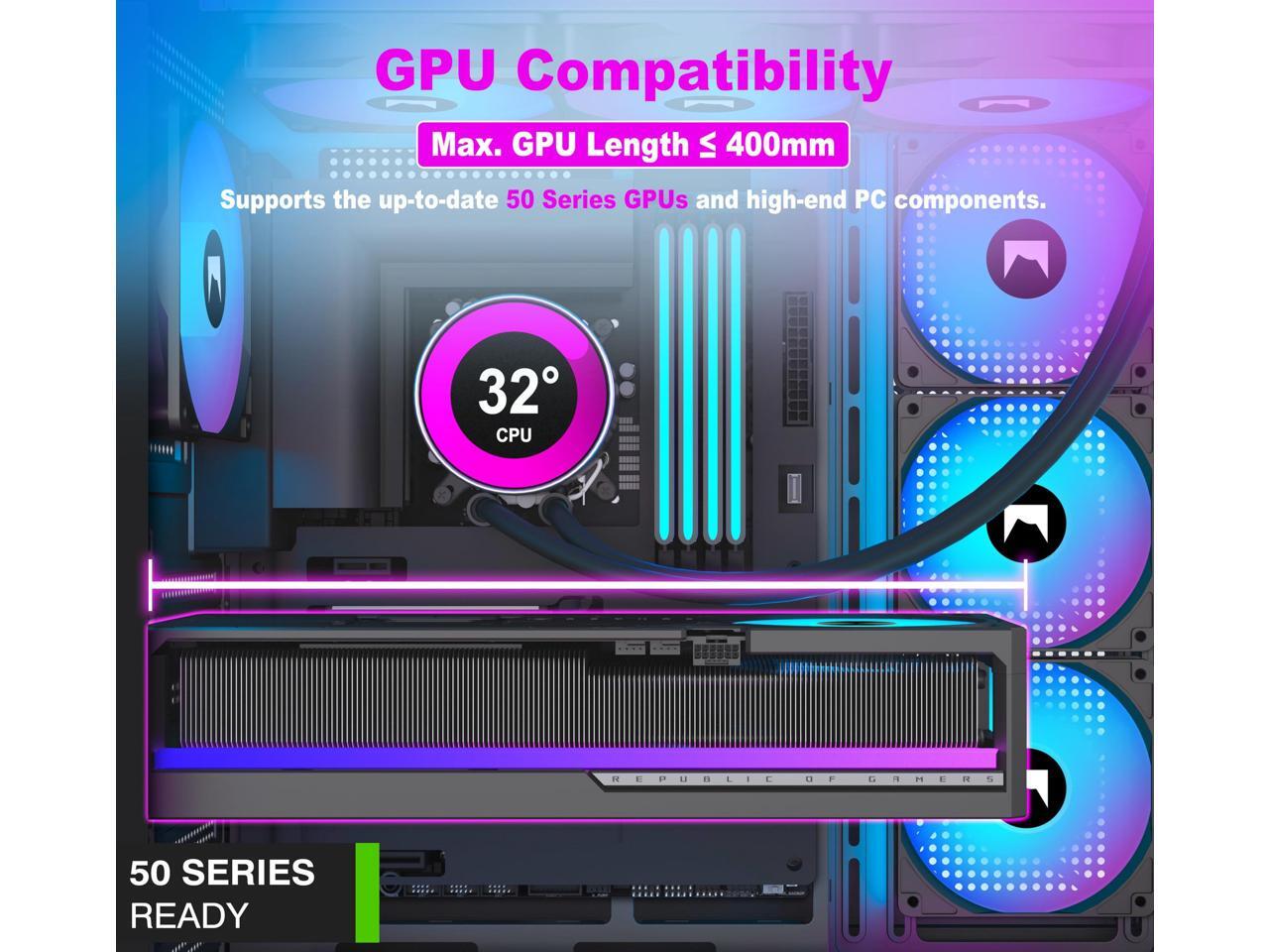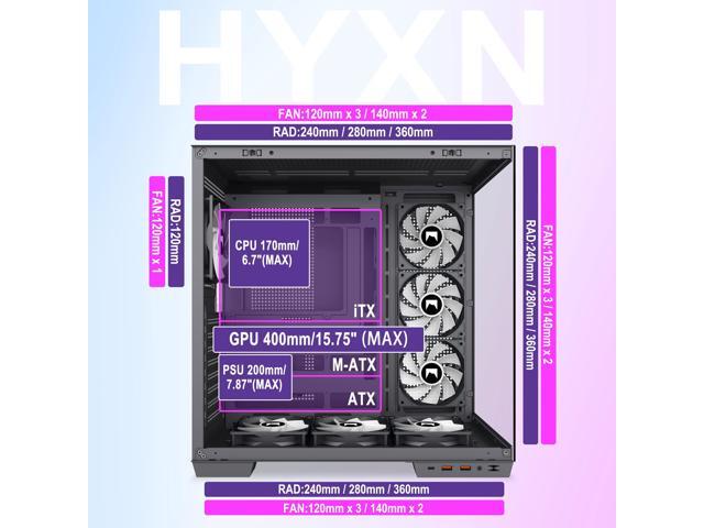 - Dual-chamber aesthetic designHYXN H1 is a panoramic 270° wide-angle field of view ATX mid-tower rectangular structure chassis developed for aesthetics. The H1 is more spacious than most similar ATX cases on the market, providing users with a powerful and high-end configuration and a cool visual experience. The PC tower case is composed of two transparent tempered glass panels, which transmit light naturally, and the tempered glass has high hardness, not easy to be damaged, and has good sound insulation effect, providing great comfort for the office/gaming environment! (Length, width and height: 420*285*430mm/16.5"*11.2"*17.3)