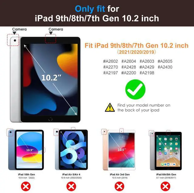 Compatibility ModelDesigned for iPad 9th Generation 2021(Model:A2602/A2603/A2604/A2605), aslo fit iPad 8th Generation 2020(Model:A2270/A2428/A2429/A2430) and iPad 7th Generation 2019(Model:A2197/A2200/A2198). Please Note: Not compatible with any other iPad model