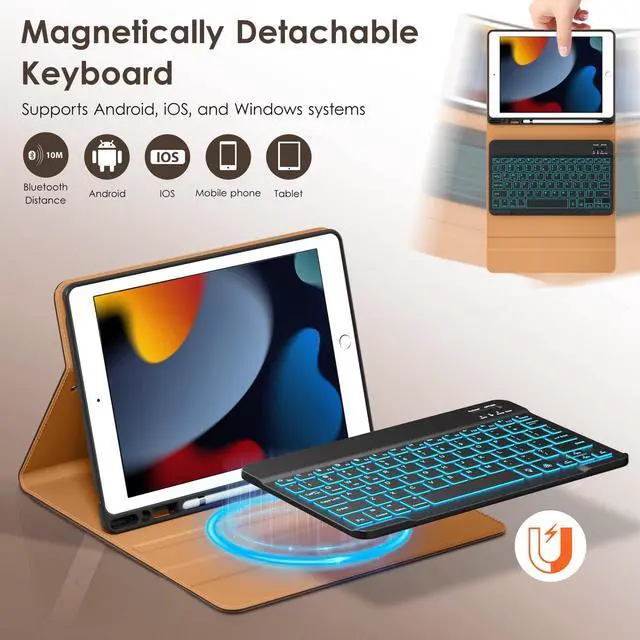 7 Colors Backlit KeyboardThis for iPad 9th generation case with keyboard is designed with laser-etched backlit keys that allow 7 vibrant colors to shine in the dark. Ergonomic and mechanical scissor keys with rebound feature to reduce noise