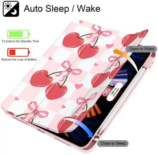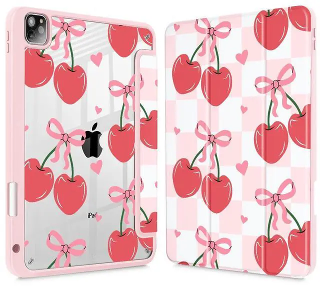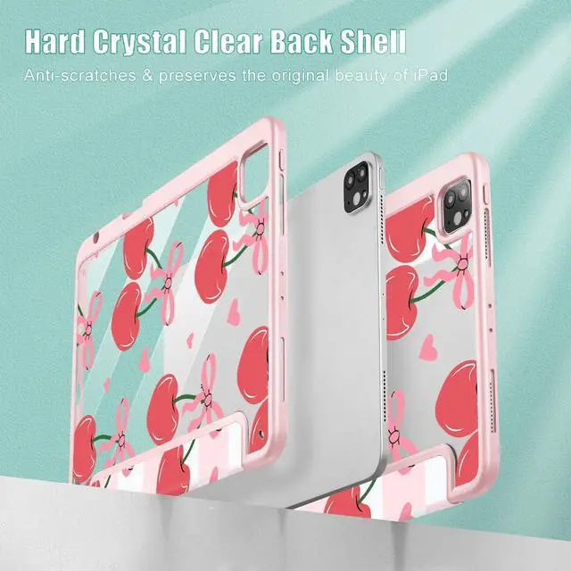 Mektron Case for iPad Pro 11 inch (4th, 3rd, 2nd & 1st Gen) 2022 2021 2020 2018, Buit in Pencil Holder with Shockproof Cover Clear Shell + Trifold Stand + Auto Wake/Sleep, Cherries Bows C353