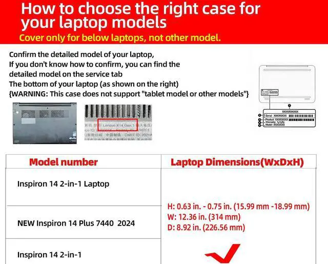 The protective cover is only suitable for Dell Inspiron 14 Plus 7440 Laptop (2024) ^^ Inspiron 14 2-in-1 Inspiron 5440 Laptop - 14.0 -inch Laptop computer case PU leather protective cover. Please check your model for purchase. It is not suitable for other 15.6 -inch machines. Don't mind buying at will. (You can refer to the size standard on the details page, thank you)Only available in this size (W x D x