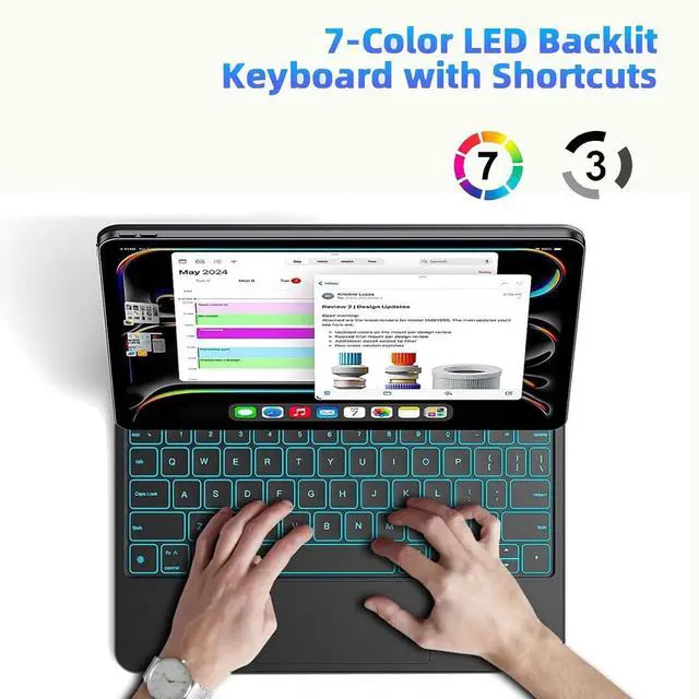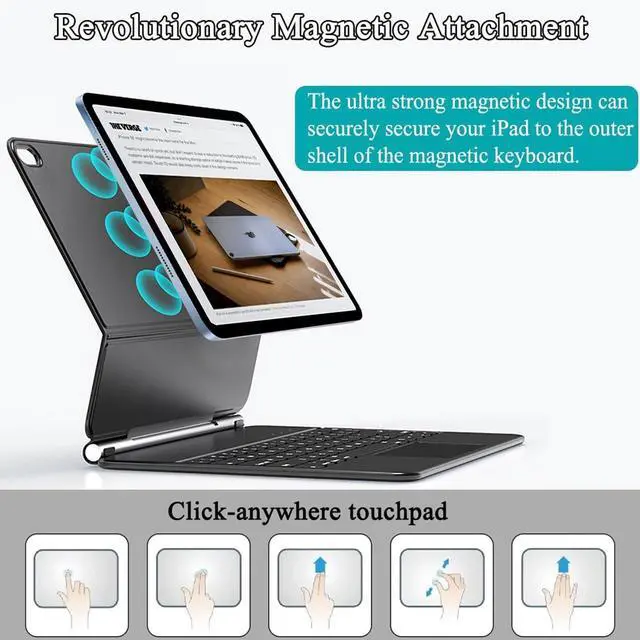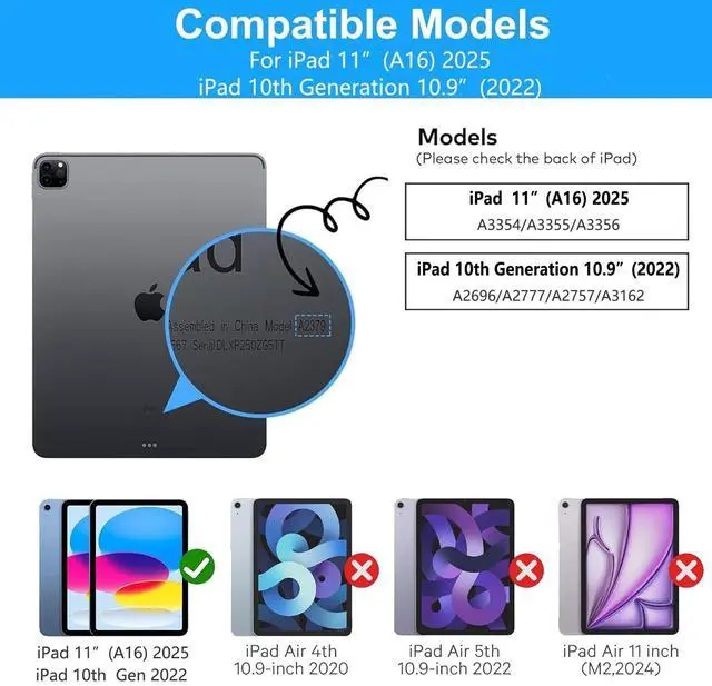 CompatibilityThis keyboard case, designed specifically for iPad 11th(A16, 2025)/10th Generation 2022, models include 2025 iPad 11th A16 (A3354, A3355, A3356), 10th Generation 10.9" 2022 (A2696, A2757, A2777). ensures a perfect fit by checking your iPad's model number on the back, starting with 'A. ' ^^ 7-Color Backlit KeysAdjusting 7 backlight and 3 levels of brightness ensures clear visuals in every setting, enhancing your immersive experience. ^^ Click AnywhereElevate your iPad 11" (A16, 2025) experience with our precise, versatile keyboard. use every millimeter of the extended, ultra-sensitive multi-touch trackpad to tap, pinch, and swipe with perfect precision and navigate your iPad in a whole new way.