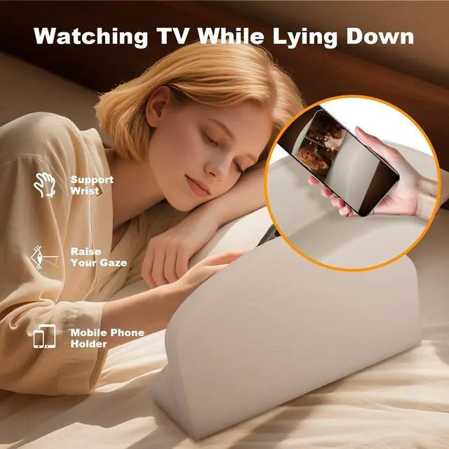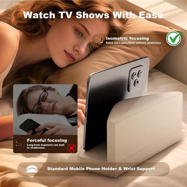 Kindle ^^ -: while lying on one side can potentially cause skin laxity on one eyelid, alter facial muscles, and exacerbate vision problems,, The phone pillow helps maintain screen-eye alignment when using your phone while lying on your side, ensuring equal distance and focused vision to help ^^: This tablet pillow stand features a raised, sloped design, providing crucial, stable support for your wrists. Whether watching short videos, playing games, or chatting, pillow phone holder helps your palms and wrists relax, effectively distributing pressure and significantly reducing hand and wrist fatigue, leaving you feeling more relaxed and comfortable ^^ Washable Cover for