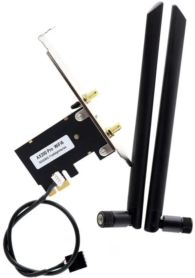 Package Includes: 1x AX200 WLAN Card2x 8dBi Antenna1x Screws1x Bluetooth Custom cable1x Low Profile Bracket1x Quick Start Guide