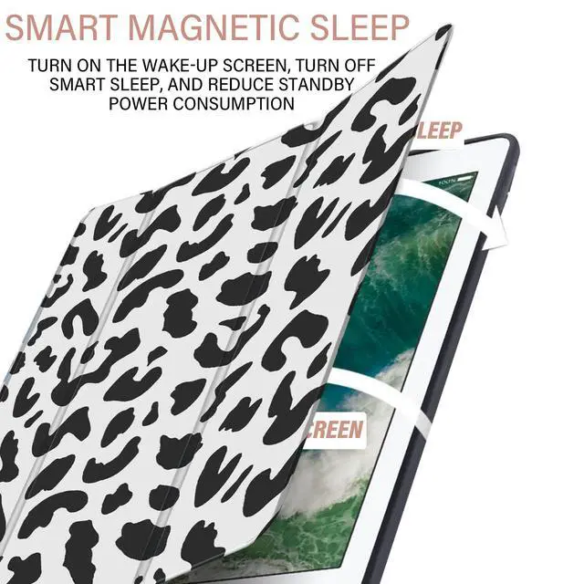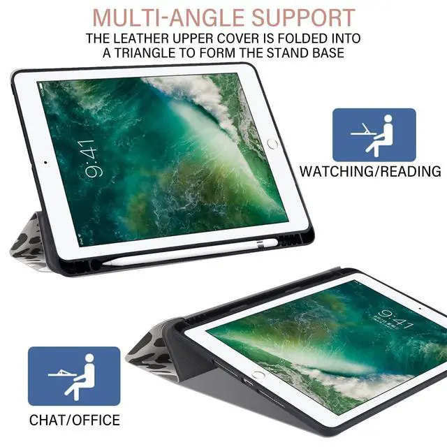 ^^ Muti-viewing AnglesThe case design of the tri-fold stand can change the angle to meet your viewing and typing needs, the lightweight design adds excellent protection to your device, the pattern used in this iPad series case allows you to tablet is more stylish and attractive. ^^ Sleep and WakeBuilt-in provides automatic sleep/wake function to save energy when the lid is closed. Cameras, speakers, ports and buttons, in precise cutouts allow full access to all ports and functions without removing the case. ^^ ReuseableThe iPad case is carefully processed and reusable.