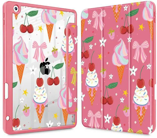 Lepeoac for iPad 9th Generation with Pencil Holder, iPad 8th/7th Gen Case 10.2-inch, [Built in Pencil Holder] Trifold Stand Auto Wake/Sleep Clear TPU Protection Back Cover, Ice Cream-Bows-Red
