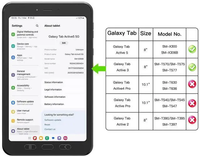 CompatibilityDesigned for Galaxy Tab Active 5 - 8 inch 2024 [SM-X306B/X300]& Galaxy Tab Active 3 -8 inch 2020 [SM-T540/ SM-T545/ SM-T547]Tablet Case, WILL NOT FIT ANY OTHER TABLETS; Provide A Safe Storage Holder for S PEN ( S Pen and Screen Protectorsis NOT included) ^^ Rugged ProtectionThis Galaxy Tab Active 5/Tab Active 3 case is made of premium hard plastic and soft shock-absorbing silicone. Advanced 3 in 1 structure design provides the better protection from scratches, drops and impacts. Precise cutout design, easy to access all features without removing case. ^^ 360 Rotating stand&