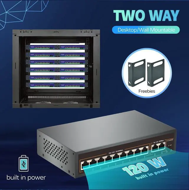 11-Port PoE Switch This 11-port Ethernet switch offers 9 PoE/PoE+ ports and 2 Uplink ports, delivering high-speed connectivity of up to 100Mbps for exceptional network performance. ^^ 6KV Lightning ProtectionPoE switch have professional lightning protection design-up 6KV port and power supply thunder prevents, with two levels of protection design respectively, effectively restrain the power of lightning from cable, which equivalent to give the entire network monitoring system with a security fence. ^^ High Power Output With support for the IEEE 802.3 af/at PoE standard protocol, this switch provides a total power output of 120W, allowing up to 30W per port.