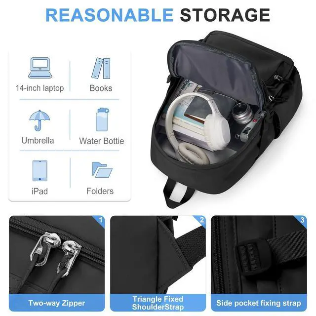 QUALITY FABRICMade of high quality waterproof nylon fabric, durable and easy to clean. Casual backpack with high quality SBS zippers, the two-way zipper is made of high quality metal, smooth to use and ensure long-lasting use. ^^ EXTRA LARGE CAPACITY This backpack offers plenty of storage space, perfect for everyday use. The backpack has four pockets of varying sizes to keep your laptop, iPad, mobile power, camera, books, and anything else you need to keep your belongings organized. In addition, there is a separate computer compartment in the main pocket that can hold up to a 15.6 -inch laptop.
