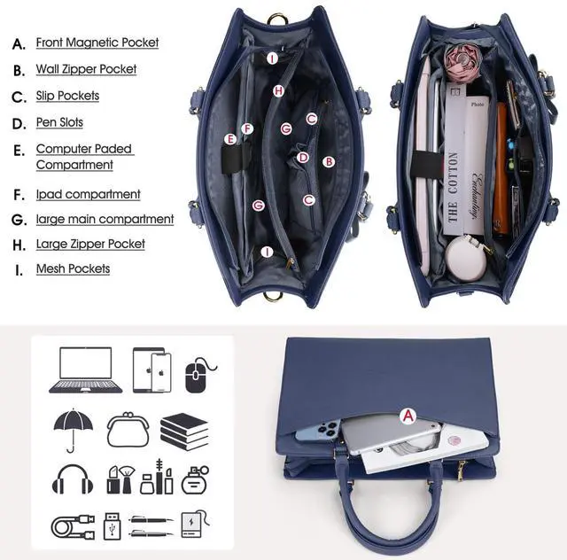 Multi-pocket Tote Bag: Features one main computer padded compartment; one tablet compartment; two elastic side pocket, one large zipper pocket; one slip pockets; two pen slots; one external wall zipper pocket and one front magnetic pocket; Combine safety with ease of use, this work tote bag is an excellent long-term partner for work, shopping, dating, college ^^