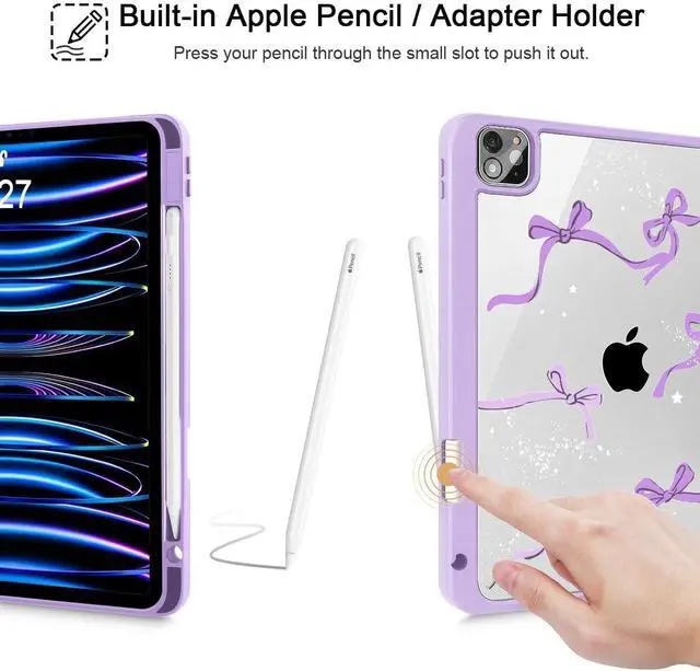 Tuiklol for iPad Pro 11 Inch Case M2 2022 Generation 4th -Built-in Pencil Holder Shockproof Cover Clear Transparent Back Shell Fit for iPad 11 2021 2020 2018 Gen 3rd/2nd/1st for Kid, Bow-Purple