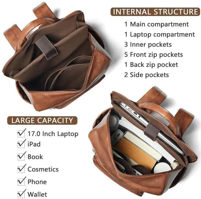 BRAND-NEW UPGRADED QUALITYThe leather laptop backpack for women is manufactured from premium upgraded vegan leather, which is wrinkle, water and wear-resistant. It's soft and sturdy can withstand daily use. Its excellent waterproofing makes it easy to cope with a variety of scenarios such as everyday splashes and light rain. The solid metal zipper and reinforced stitching ensure long-term durability. This computer backpack for men is perfect for college, short trips, work, office and daily use ^^ MULTI-POCKET BACKPACKThis work backpack for men has a total of 13 pockets. The main compartment provides ample space for travel essentials, college supplies and work necessities.