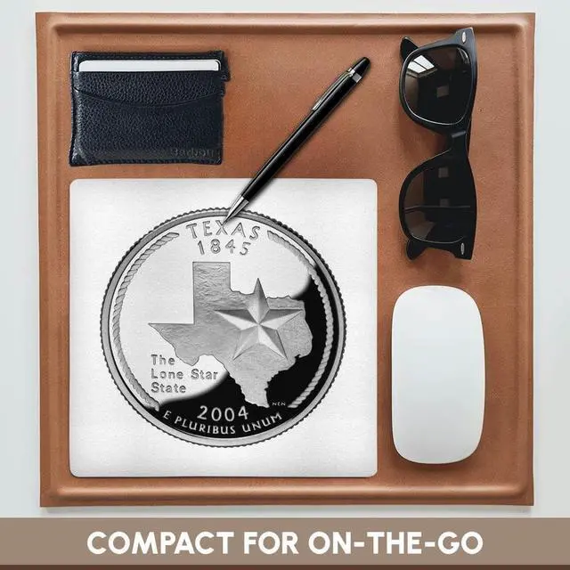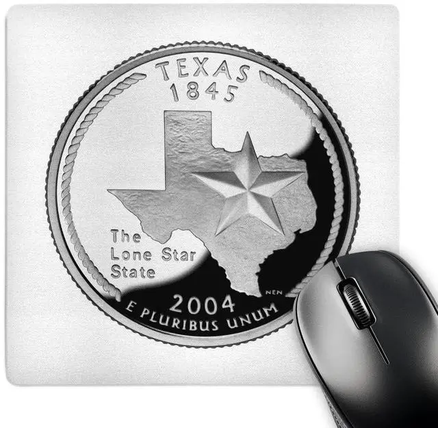 Texas Collectible Quarter Mouse Pad is 8" x 8" x. 25" and is made of heavy-duty recycled rubber. Matte finish image will not fade or peel. Machine washable using a mild detergent and air dry.