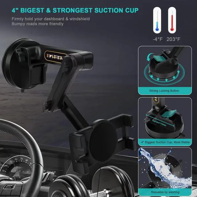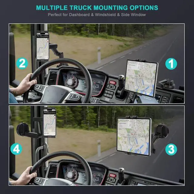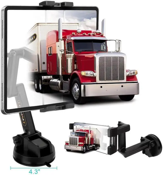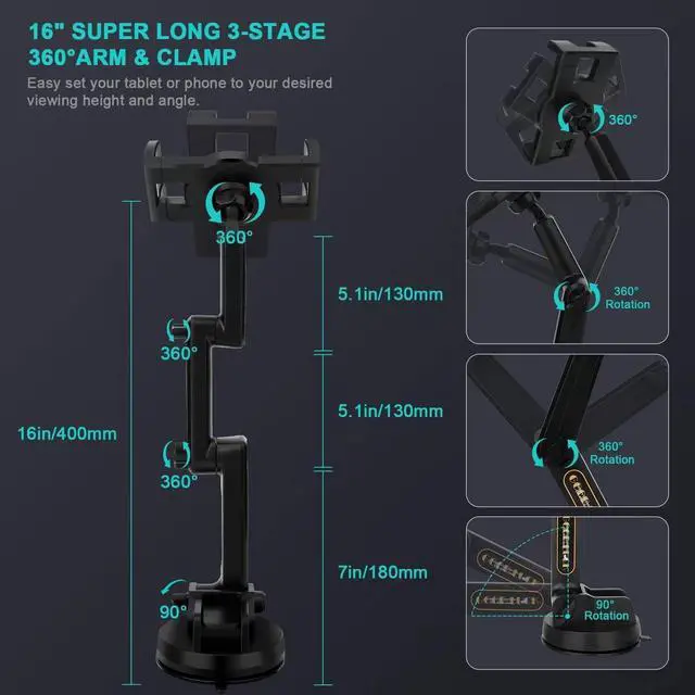 (Note: The suction cup is reusable and washable, if it gets dirty or loses its grip, simply rinse in water and let air dry to restore the stickiness. ) ^^ 16LONG & 360 3-STAGE ARM & 360 CLAMPThe clamp of this suction cup tablet truck mount with swivel ball can be 360 rotated. The adjustable sturdy 3-piont arm can be extended from 7" to 16", the upper & middle arm is separately 5.1" long and 360 adjustable, the lower arm is 7" and 90 adjustable, the total height of this 3-stage arm is up to 16", the 360 adjustable super long arm meets your perfect viewing angle and distance without blocking your sight, perfect for your safe trip. ^^ WIDE COMPATIBILITYThe stretchable side clamp ( 0.8" thickness) of this iPad holder for truck can be extended from 4.7" to 10.6", fits for all 4.7" - 12.9" smartphones and tablets with or without case, such as iPad Pro 12.9 /11/ 10.5 / 9.7, iPad Air 6/5/4/3/2, iPad Mini 6/5/4/3/2/1, iPhone 17/Pro/Max, iPhone 16/Pro/Max, iPhone 15/Pro/Max, iPhone 14/13/12/11/XS/XS Max/XR/X/SE/8 Plus/8/7/7 Plus/6 Plus/6, for Samsung Galaxy Tab/ Galaxy Note/ Galaxy S25/S24/S23/ Galaxy Z Fold 6/5/4/3/Z FliP 6/5, Fire HD 10/8/7/6 and etc.