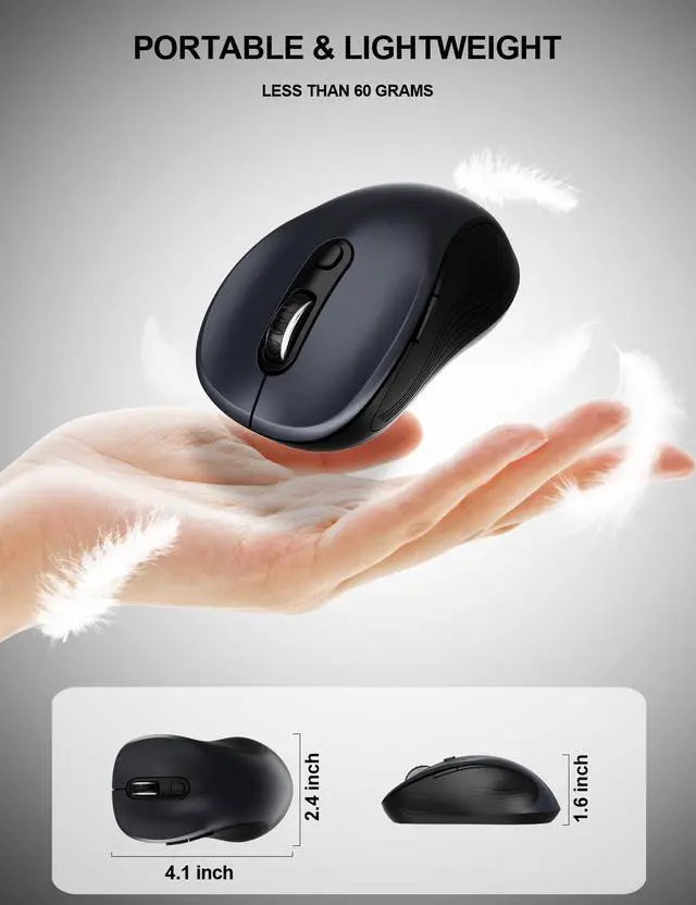 Ergonomic Design, All-day Comfort. This wireless mouse features a streamlined, curved design that follows the natural curves of your hand. Skin-friendly silicone and plastic on the sides provide a comfortable grip. Significantly reduces stress on thumbs and wrists when in use.