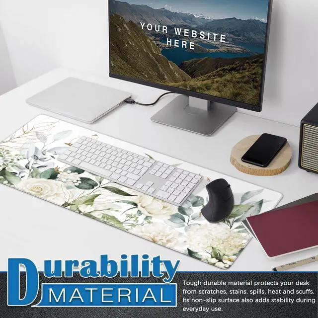 Large Mouse Pad White Rose Peony Mouse Mat for Home and Office Eucalyptus Leaf Large Gaming Mouse Pad for Laptop Keyboard Mat with Non-Slip Rubber Base,Stitched Edges (31.5"x15.7")