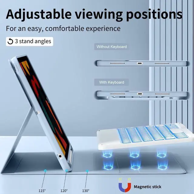 Note: Kindly verify your iPad's model before making a purchase by locating the model number (AXXXX) on the back of your iPad ^^ 7 Colors Backlit KeyboardThe iPad 9th/8th/7th Generation Keyboard Case features laser-etched illuminated keys and offers 7 LED backlighting colors and 3 brightness options for a comfortable typing experience even at night. You can choose your favorite color to enhance the visual enjoyment and make typing a relaxing and enjoyable experience ^^ Rechargeable & Long Life BatteryOur keyboard case for the 9th/8th/7th Gen iPad, featuring a built-in high-capacity battery, offers enhanced energy efficiency and reduced power consumption. It comes with a Type-C charging cable that can be fully charged in 2 hours without the need to replace the battery, ensuring that you can continue to work for up to 230 hours ^^ Magnetic Detachable Backlit KeyboardThis iPad 10.2 -inch case with keyboard features a magnetic design that holds the keyboard securely in place. With an easy, fast and stable connection to IOS, Windows and Android via Bluetooth, it's perfect for working, typing, editing or watching videos, dramatically increasing the productivity of your iPad ^^ Buit-in Pencil Holder & Sturdy TPU MaterialThe keyboard case compatible with the 9th, 8th, and 7th generation iPads boasts a handy pencil holder on its left side, allowing for effortless storage and retrieval of your pencil (Pencil not included).