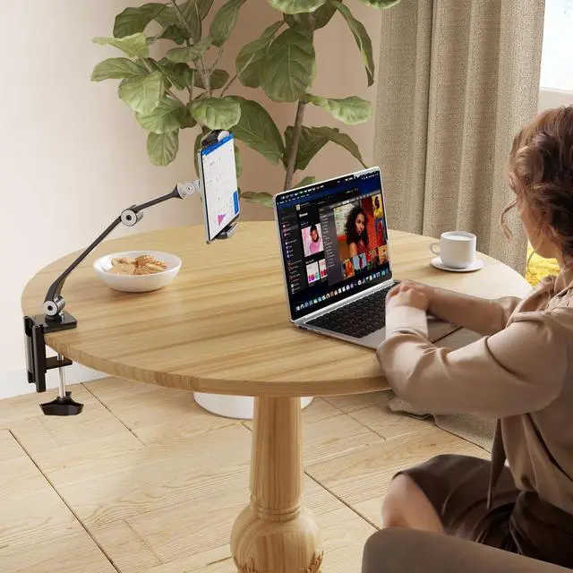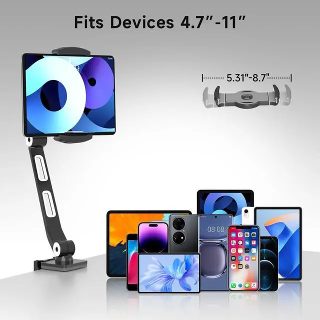 Universal Desk Mount - ideal for most tablets and smartphones with diagonals from 4.7" to 11" that weigh up to 6.6 lbs ^^ Extendable - two-end expandable bracket with inner length from 5.31" to 7.48"; arm length, 7.9" & 6.6" (200mm&167mm); clamp-style base, clip from 0.4" - 3.19" ^^ All direction - 360 rotation holding bracket with 180swivel arms to meet any viewing angle ^^ Humanized - reserved charging port to charge while using, hands free for reading, watching movie, etc. ^^ Stable and durable - premium aluminum foldable frame for durability and easy portability, non-slip silicon bracket for firm grip