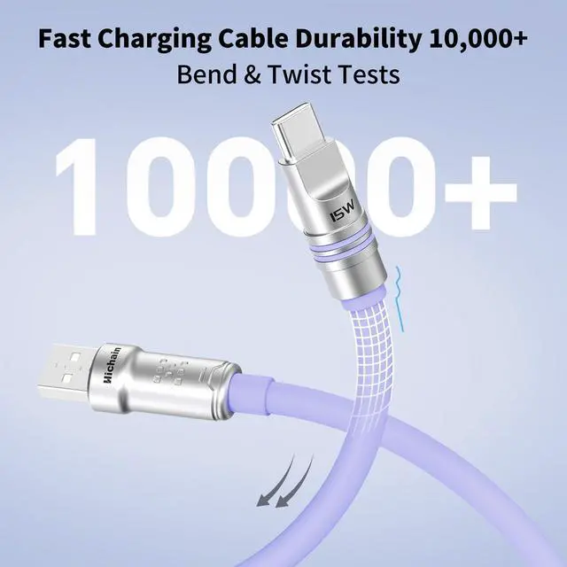 Tested to endure over 10, 000 bends and extreme temperatures (-20C to 80C), it remains flexible and reliable in all conditions, withstands daily wear, drops, and twists. Easily handles various scenarios like outdoor charging and car charging ^^ Tangle-Free Liquid Silicone & Tear-Resistant Design - Ultra-soft silicone exterior is skin-friendly, dust-repellent, and stays tangle-free. Usb a to usb c cable smooth texture feels great in hand and resists cracking, even after prolonged use. Actually our usb c cable is thicker than standard charging cables, perfect for home or on-the-go charging, especially when caring for toddlers.