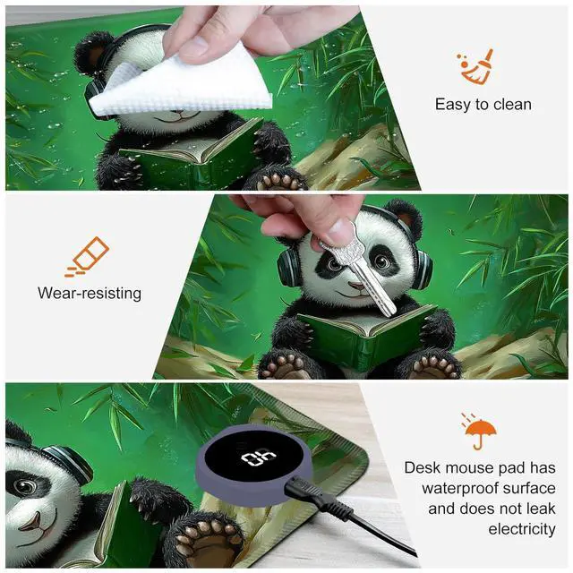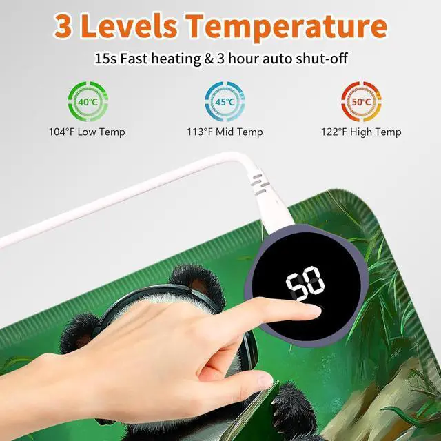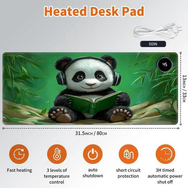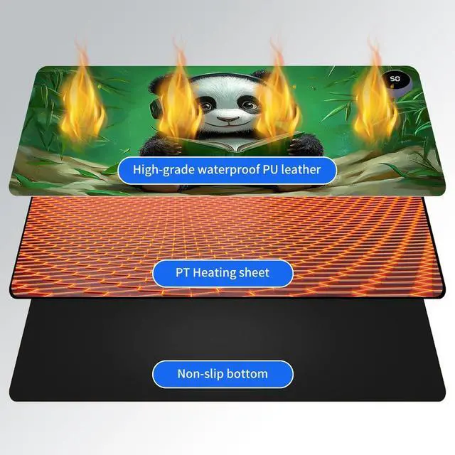 Heated Desk Mat with 3 temperature settings: --1. Low (40C / 104F) for gentle warmth--2. Medium (45C / 113F) for consistent comfort--3. High (50C / 122F) for a quick boost of heatAuto Shut-Off Design--Mousepad warmer includes 3-hour auto shut-off timers. Long-press the power button until it flashes to activate. helping you save energyDurable Material--Crafted from smooth PU leather, Gaming Mouse Pad Warmer features a waterproof and easy-to-clean surface--Heated Desk Mat Non-slip base keeps it securely in place, providing a stable surface for your keyboard, mouse, and laptopLarge & Multi-Functional Design--Large Mouse Pad at 31.5 x 13 x 0.08 inch (80x33x 0.2 CM) is spacious enough for your desk essentials, keeping your workspace neat and organizedPattern Printing Design--Unique Pattern Printing Heated Desk Pads decorate your study, computer desk, bedroom or office, perfect accessory for any modern office and homeNote: When using PU leather desk mat, do not place any items that are easily ignited or damaged by high temperatures, such as laptops, batteries, or other items that are not resistant to high temperatures. If you smell some leather odor during the first use, it will disappear after being left for a period of time. Due to long-term curling and cold weather, the sides of the heating mouse pad are slightly raised. After heating, warm mouse pad will return to a flat state.