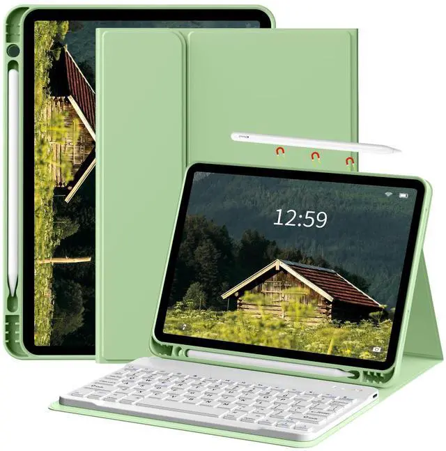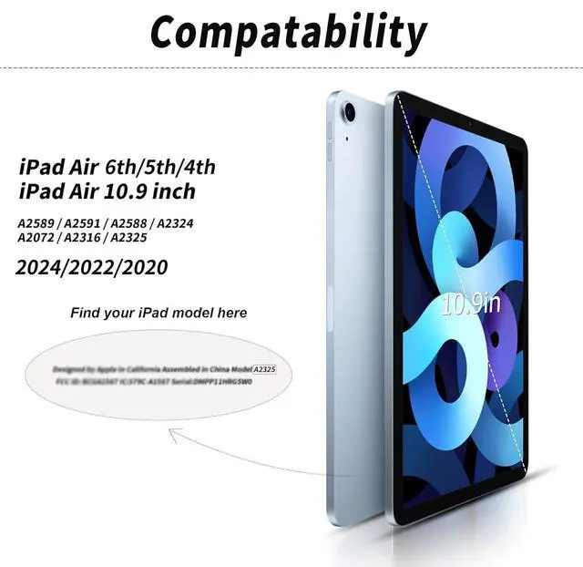 Model: A2589/A2591/A2588/A2324/A2072/A2316/A2325/A2902/A2903/A2904). NOT compatible with any other iPad models. Please check the back bottom of your iPad to find the model number before placing order. ^^ Slim Wireless Bluetooth KeyboardThe slim ( 6.2 mm) removable keyboard is attached to this iPad air keyboard magnetically (supporting Windows, IOS & Android System), let your iPad instantly become a portable laptop, perfect for working, typing, editing or watching videos, greatly improved your iPad productivity. ^^ Long Battery Life & Multi Angle Support Built-in industry-high rechargeable Li-polymer battery make the wireless keyboard of this iPad air 5th generation keyboard stand by for more than 3 days after 2-3 hours of full charge. The protective shell can be placed at different tilt angles to adjust the optimal viewing angle, very flexible and user-friendly. ^^ Buit-in Pencil Slot & Sturdy PU MaterialThe iPad air 4th generation case with keyboard has a convenient left side built-in pencil slot that easy to storage and remove your pencil (Apple Pencil is Not included). Premium PU leather cover is waterproof, scratch proof and fingerprint proof, providing full protection for your beloved tablet. ^^ Precise Cutout & Auto Sleep/Wake FunctionPrecise cutout allows full access to all ports, user interface, sensors, speakers, microphone and cameras.