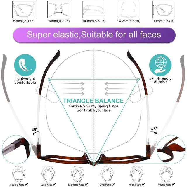 Say goodbye to dizziness, blurry and distortion. ^^ Comfortable fit - Crafted by lightweight and colorfast frame, classy rectangular style, HD magnified lenses, well-designed and hand-made to give you all-day comfort. With flexible spring hinge wont pinch your face; sturdy metal spring is more durable and not easily damaged. Full ergonomic design with blue light protection give you a all-day comfy wearing. ^^ Value accessories - A small screwdriver to tighten the screws regularly; a glasses chains to avoid loss and breakage; a soft cloth to keep reader clean; a drawstring bag to carry; as a beautiful gift for friends and families.