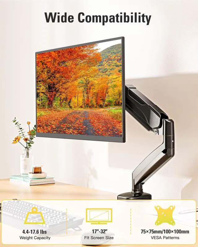Free Up Desktop Space: Compared to monitor stands with large base, this single monitor mount lifts the screen from the desktop, freeing up more desktop space for office accessories. Additionally, the monitor arm with a built-in cable management system that effectively hides wiring, making the work environment tidy and more aesthetically pleasing.