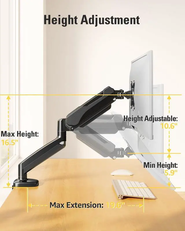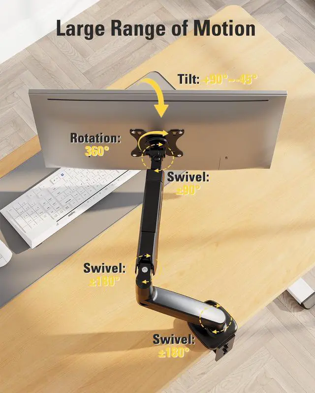 Full Motion Adjustment: Monitor mount with gas spring design allows you to extend your screen up to 19.6 and rise up to 16.5 in height. It also features +90/-45 tilt, 90 swivel, and 360 rotation for landscape or portrait orientation, you can always find the ideal viewing angle whether you are standing or sitting. ^^