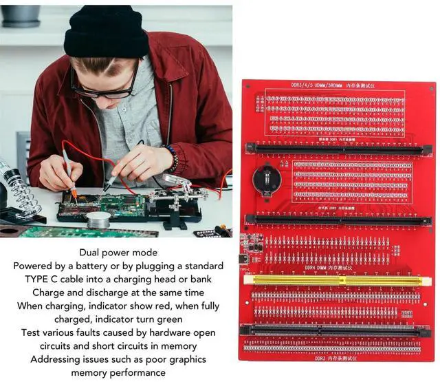 Sensitivity] RAM tester indicator lights indicate poor with gold fingers, assisting in identifying faulty circuits for quick resolution. ^^ [Compatibility] RAM memory diagnostic analyzer Suitable for desktop ddr3, ddr4, ddr5udmm, ddr5rdimm memory, making it an ideal choice for repairing computers without causing any harm. ^^ [User-friendly Design] RAM tester ddr3 ddr4 easy-to-use memory diagnostic analyzer with indicator lights for quick fault detection and memory module testing. ^^ Power Mode] Ram memory tester can be powered by battery or type c cable, allowing for charging and discharging at the same time.