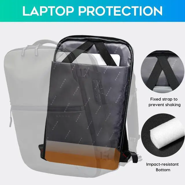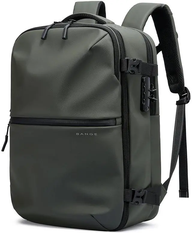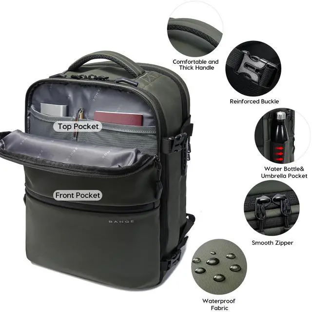 Smart & Organized Large Capacity BackpackWith dimension 18.9 * 11.7 * 5.9 inch and 32L capacity, BANGE backpack features multiple compartments, including a large main compartment for business traveling, a padded laptop sleeve for 15.6 inch laptop, two front pocket for quick-access essentials, two separate wet pouch secures liquids for cosmectics, and two shrink side pockets for water bottle or umbrella. This backpack is ideal for air travel, camping, or short getaways. ^^ Waterproof & Anti Wrinkle Backpack Crafted from waterproof polyester, this backpack can prevent the liquid going effectively (the zipper can not be waterproof), so it is perfect for urban adventures or rainy-day outings.