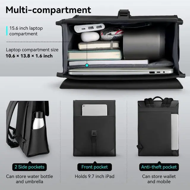^^ Multi-compartment Backpack: One separate laptop compartment fits 15.6 inch Laptop as well as 15 inch, 14 inch and 13 inch Laptop. One spacious main compartment fits books, clothes or travel supplies. The front pocket can store 9.7 inch ipad. Besides, hidden zipper pockets for additional anti theft protection on the back of the backpack. And there are two side pockets, so you can store your bottle and umbrella.