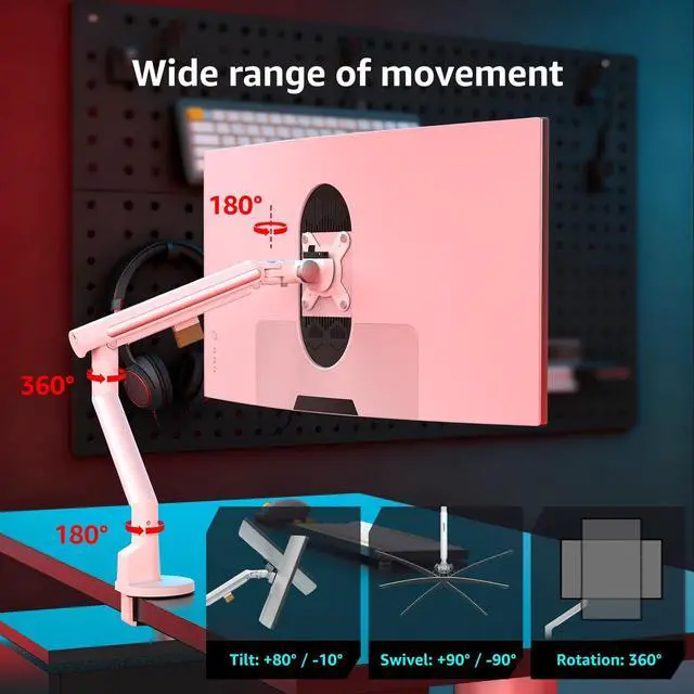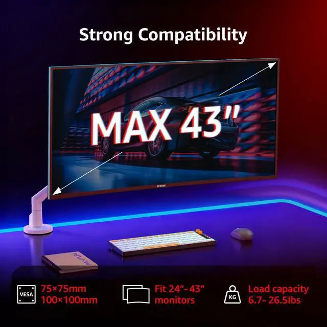 Wide Compatibility for 24-43 Inch MonitorsThis single monitor arm is specially designed for 24 to 43 inch flat/curved screens, with a weight capacity of 6.6 to 26.4 lbs. It perfectly fits most mainstream office, gaming, and ultrawide monitors, freeing up your valuable desk space. ^^ Sturdy C-Clamp Base & Pure Mechanical SpringFeatures a C-Clamp ONLY design for easy and tool-free installation on desks up to 8cm thick. Unlike gas spring arms, our durable mechanical spring mechanism provides consistent lifting force and long-term reliability without the risk of pressure decay over time.