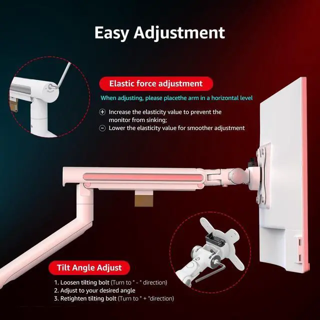 ^^ Full Motion Ergonomics for Perfect ViewingAdjust your screen to the most comfortable position effortlessly. The monitor mount offers 270mm height adjustment, 360 smooth rotation, and an extensive tilt range of +80 (up) to -10 (down), promoting a healthier posture whether for work or gaming. ^^ Robust Build & Universal VESA MountConstructed with high-quality aluminum alloy through die-casting and precision processing, ensuring stability and shake-free performance even at full extension. Comes with standard 75x75mm and 100x100mm VESA patterns, making installation quick and universal. ^^ Simplify Your Setup & Trusted QualityWe cut the redundancy and deliver what you truly need: a simple C-clamp, a reliable mechanical spring, and broad compatibility. Each mount undergoes strict quality control to ensure it securely holds 6.6 - 26.4 lbs, providing a premium and hassle-free experience for your workspace.