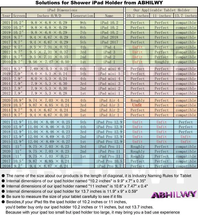 Very Important: Internal dimensions of this waterproof shower tablet holder is 10.6" x 7.47" x 0.4" (This is very very important. Please see the third products picture to be sure to measure the dimensions of your tablet carefully to check if it fits). It compatibles with Ipad and all kinds of tablet under 11 inches, but not 12.9 inches. This is a latest technology upgraded model.