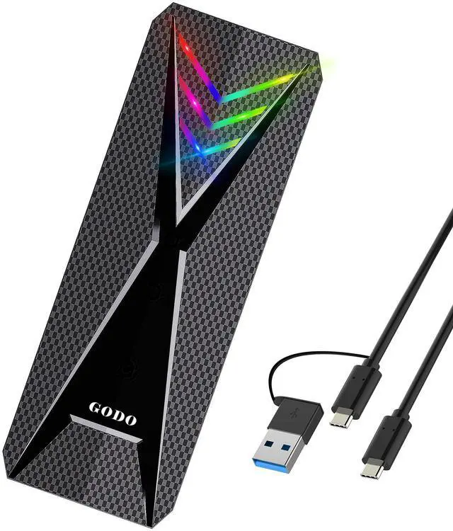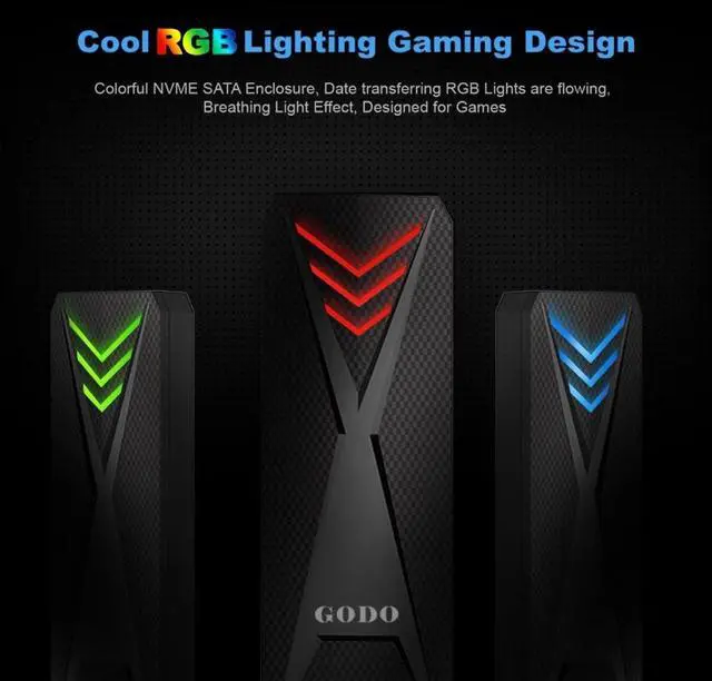 2 nvme sata enclosure: M. 2 enclosure up to 10 Gbps high speed M. 2 Nvme 6Gbps speed M. 2 SATA though USB 3.1 Gen 2, perfect solution for data transfer and data backup. One HD movie transfer only takes 2-5 seconds. ^^ Cool RGB Gaming DesignThis RGB m. 2 nvme enclosure/m. 2 to sata adapter has more color atmosphere. The red, green and blue are alternately switched slowly during standby; It flashes quickly during reading and writing. The blue light breathes and flashes during sleep. The red light is always on when the SSD is not installed. Working status at a glance. ^^ Tool-Free DesignGODO M. 2 sata/nvme ssd enclosure rgb allows quick and easy installation of your M. 2 SSDs. Plug and play, no driver needed. Compact and portable for easy carrying while on the go.