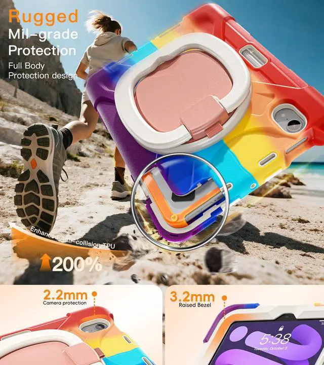 Mini 6 2021 (Model: A2567/A2568/A2569). Please check the model number on the back before purchase. ^^ [Built-in Triple-Layer Protection] Advanced 3-in-1 structure, crafted from high-quality PC and shock-absorbing silicone materials, provides comprehensive protection for your tablet, effectively guards against accidental drops, vibrations, slips, and scratches. Don't worry about your iPad slipping from your child's hands and breaking. No need to remove the shell to fully access all ports, buttons and cameras. (Does not include screen protector) ^^ [Amazing Multi-function Handle-Kickstand] The 360 Degree Rotating Kickstand provides multi-angle viewing, offering a pretty convenient user experience for film watching, working and typing. The stand remains highly stable on various surfaces. It can also be opened as a comfortable handle for secure gripping and carrying. ^^ [Removable & Adjustable Carrying Strap] Portable Shoulder Strap offers convenient, hands-free portability for your iPad at work, on trips or outdoors. You can also hang it behind a car headrest or wherever you want. ^^ [Safe Storage of Apple Pencil] This iPad Mini protective case provides a built-in pencil holder that hugs your iPad closely. Simply insert your Apple Pencil into the holder for secure storage and simultaneous charging.