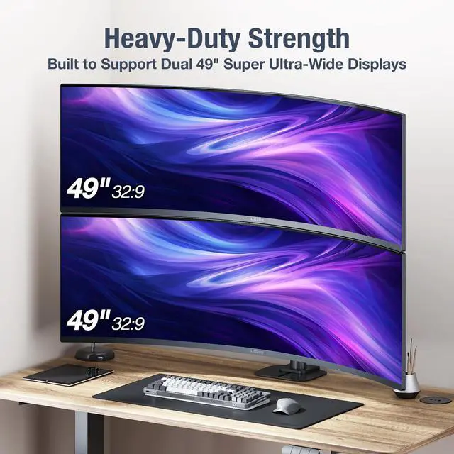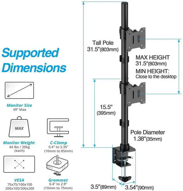 Tall And Sturdy Monitor Pole Mount - AVLT dual monitor heavy-duty pole mount with quick-release VESA plate for simple super ultrawide screen installation and concealed cable management for a tidy setup. ^^ Fits 17" to 49" Screen - Dual vertical monitor desk mount fits most 49-inch flat/curved ultrawide monitors up to 44 lbs (20 kg) each in weight with VESA 75x75mm 100x100mm 200x200 mounting holes. ^^ Space Saving - Solid metal base only takes up 3.54" x 3.5" (90mm x 89mm) desk surface. The c-clamp and grommet mounting options support up to 3.35" (85mm) desk thickness and provides stability when adjusting monitors.