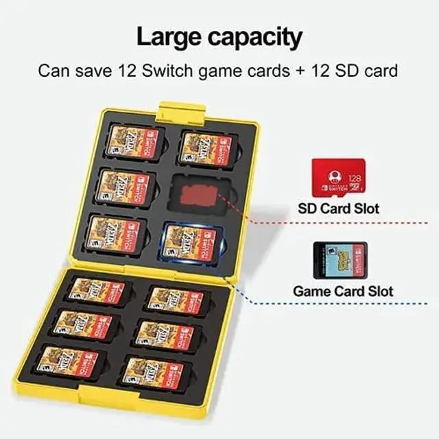 Keep your Nintendo Switch games organized and protected with this slim and portable hard shell case. Crafted for durability, it offers shockproof protection to safeguard your game cartridges from damage. With its compact design, this case easily slips into your bag or pocket, ensuring your games stay safe wherever you go. Featuring 12 cartridge slots, it provides ample storage for your favorite Switch games. Additionally, the case includes 12 memory card slots for storing additional game data or accessories. Whether you're on the move or at home, this case is an essential accessory for any Switch gamer.