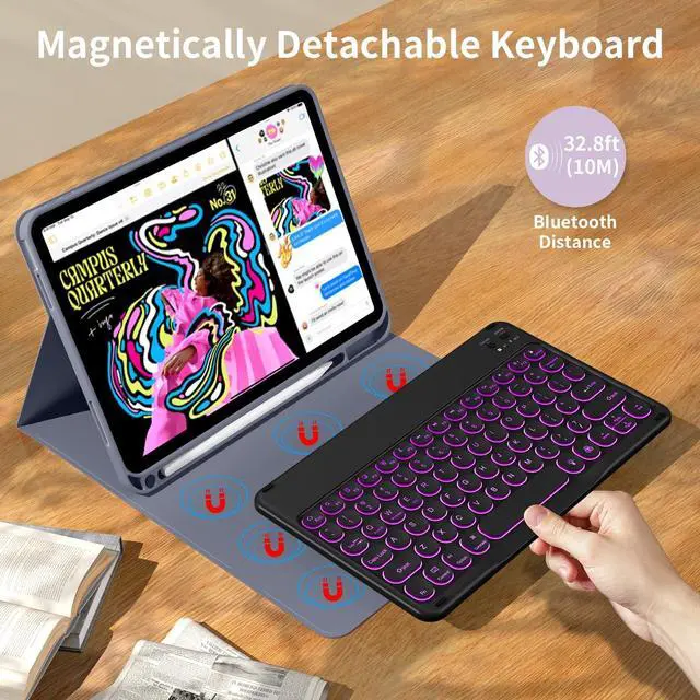 Slim Wireless Bluetooth KeyboardThe slim (6.2mm) removable keyboard is attached to this iPad cover with keyboard magnetically (supporting Windows, IOS & Android System), let your ipad instantly become a portable laptop, perfect for working, typing, editing or watching videos, greatly improved your iPad productivity.