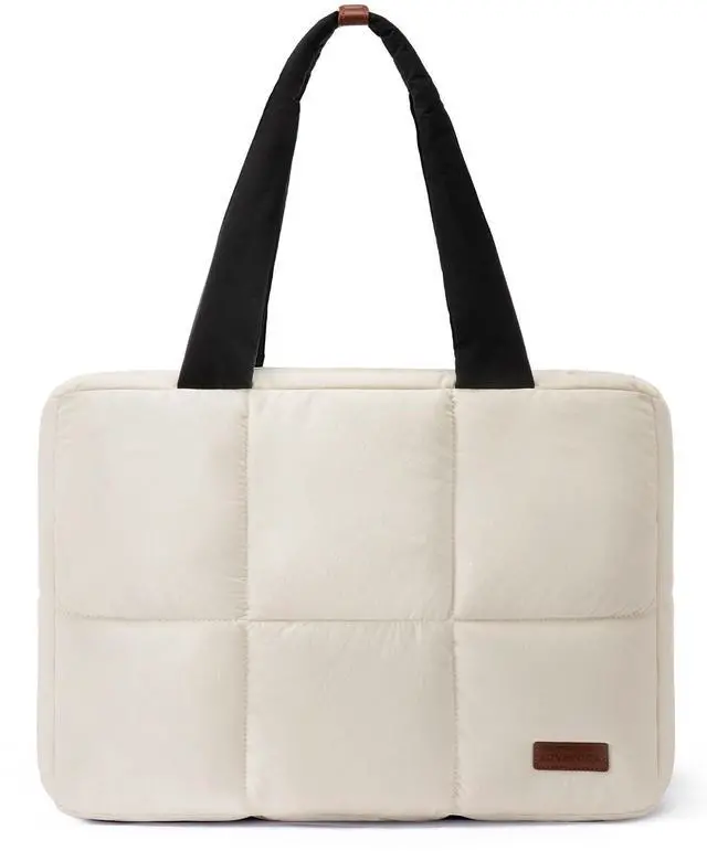 Light & ToughThis puffy tote bag weighs just 1.03 pounds, lighter than an iPad. Made with waterproof outer fabric and soft puffy lining to keep your belongings dry and comfortable. The durable polyester interior resists tearing. Simply toss it in the washing machine for easy cleaning. ^^ Anti-Theft DesignMeasures 17"L 12.5"H 5"W with 11" handles. Padded 15.6" laptop compartment absorbs shocks, while the top hidden theft-proof zip pocket securely holds wallets/passports for worry-free travel. ^^ Spacious & OrganizedFeatures 1 zippered pocket, 2 open pockets and 2 pen slots to keep your essentials tidy.