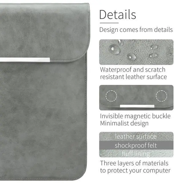 PU leatherWater-resistant PU leather exterior, inner plush lining together with neat stitches exude visual texture, protect your tablets from any scrapes, splash and daily wear. ^^ Magnetic ClosureFeatures a flap with hidden magnets, makes it easy for you to take out or insert your laptop without scratching your Laptop. ^^ Slim & LightweightUltra slim design, allows this case to be carried solo or fit in your favorite bag for more protection. ^^ With pouchComes with a practical and stylish pouch for laptop /MacBook accessories, such as charger, hub, cable, mouse, earphone, etc.