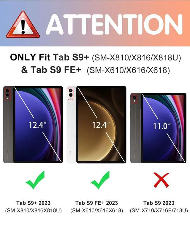 Compatible ModlesThis case compatible with Samsung Galaxy Tab S9 Plus Case and with Samsung Galaxy Tab S9 fe Plus Case. Please check your model before purchasing. ^^ Adjustable AnglesThis for Samsung Galaxy S9 Plus Case, for Galaxy Tab S9 fe+ case provides two supporting angles, creating a comfortable viewing and operating experience for you. ^^ Build-in Pencil HolderA build-in pencil holder was designed in this for Galaxy S9 Plus Case/ for Samsung Galaxy Tab S9 fe+ Case. Making it easier to put in and take out your pencil, and also prevent accidental loss and damage.