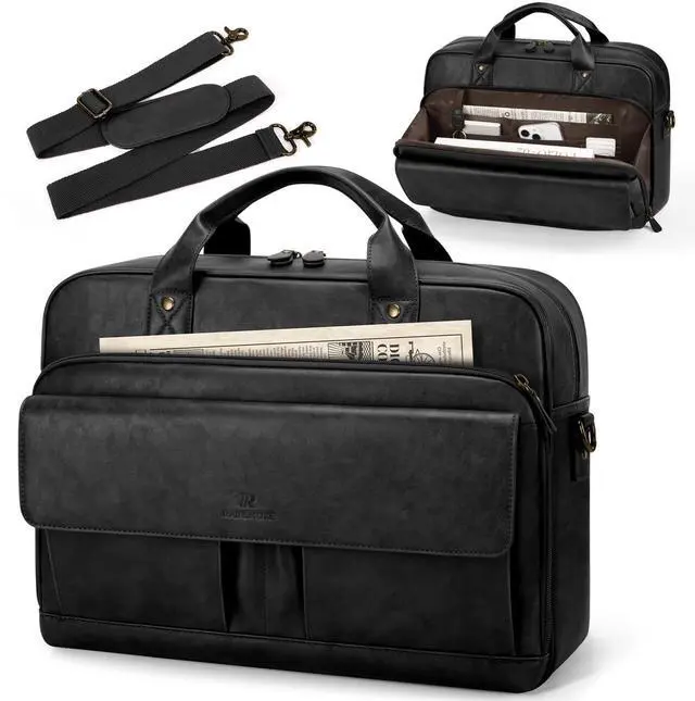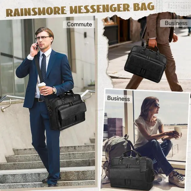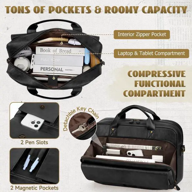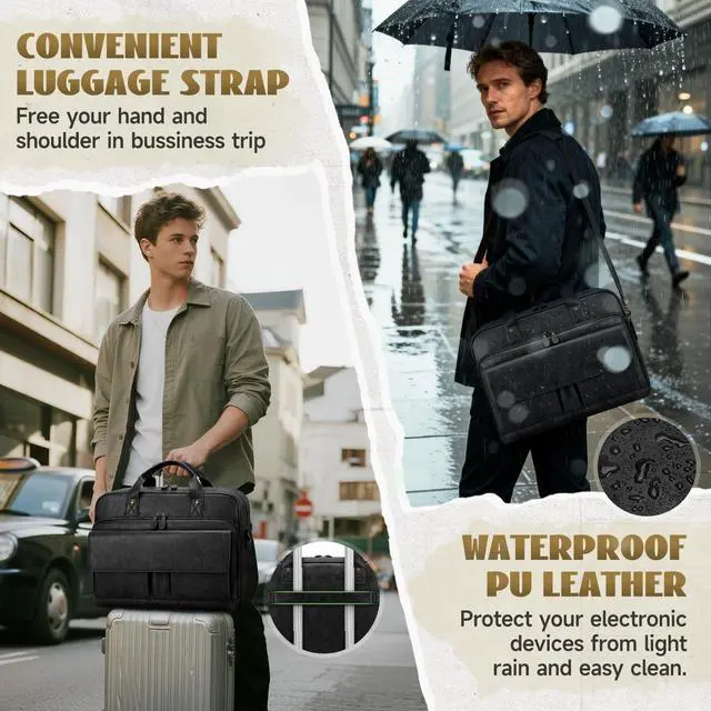 2 front pen holders and 2 magnetic pockets of the laptop bag for quick access items you need on the go. No more diggingeverything has a dedicated place for instant access ^^ Versatile Carrying Options - Enjoy ultimate flexibility with the detachable and adjustable shoulder strap (72cm-128cm / 28-50 inches). Convert the laptop bag as a classic shoulder bag, satchel or a sleek laptop briefcase according your need. The integrated luggage strap allows you to securely attach this laptop bag to your suitcase handle, making business trips effortless and hands-free ^^ Premium & Stylish Messenger Bag - The vintage-inspired messenger bag for men is complemented by premium waterproof PU leather and corrosion-resistant metal hardware.