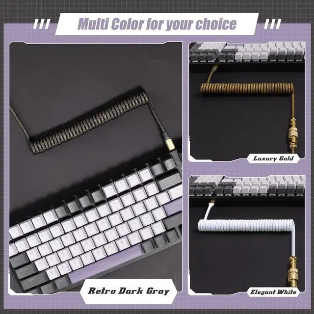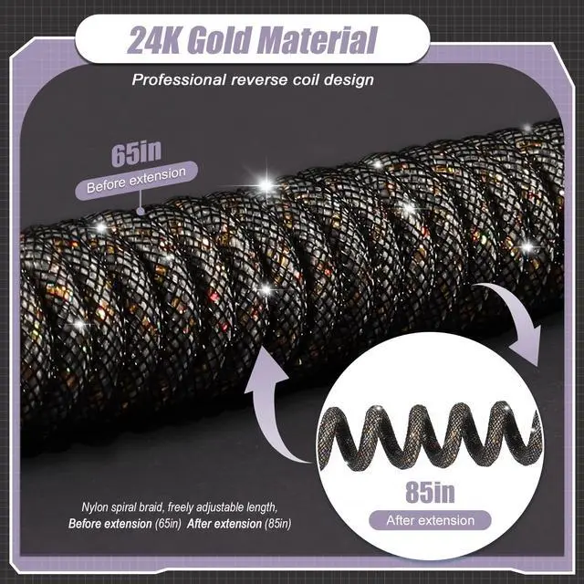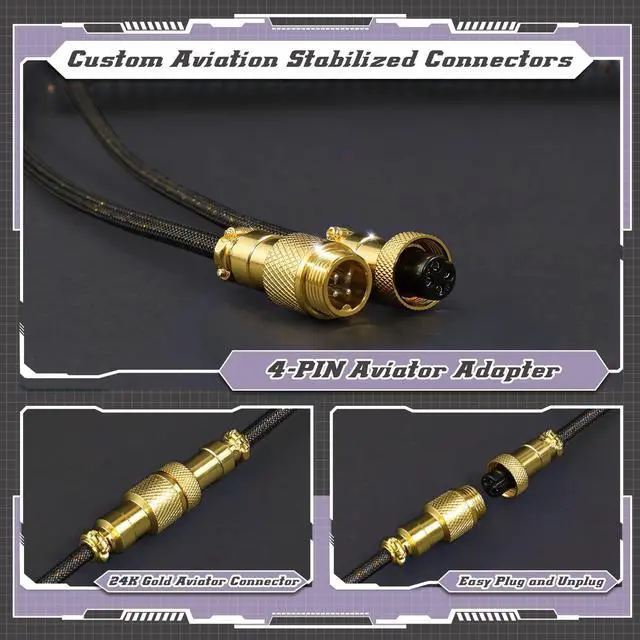 Fashion and DurableThe coiled keyboard cable uses high quality copper wire and aluminum shielding foil as the core, sturdy and durable nylon braided material with luxurious gold thread, to ensure stable transmission, resistance to pulling, not easy to break, level up your keyboards aesthetics and desktop setup with its eye-catching timeless industrial design and premier build quality. ^^ Practical 24K Gold Aviation ConnectorThis coiled USB keyboard cable adopt popular aviator connector which allows you to quickly attach different cables to your keyboard or other accessories, joining the coiled and straight section of the cable is a heavy-duty, 24K gold, 4 pin aviator, and the aviator connection part has been extra reinforced to protect them from breaking off, more stable.